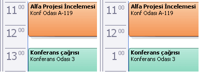 Örneğin, ay görünümündeki Takvim‘de, Birleşik Devletler için varsayılan ayarları kullanıyorsanız, Outlook 12 saatlik bir görünüm görüntüler. Saat 12:59’un ardından saat 1:00 PM olarak görüntülenir. Diğer ülkeler/bölgeler 24 saat görünümünü kullanır.